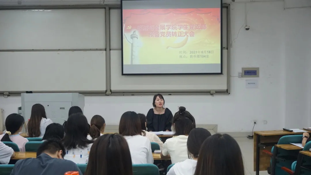 6月18日,德赢Vwin官方区域合作伙伴学生党支部于教学科研楼104教室召开预备党员转正大会,学生党支部书记蔡萌主持会议,全体学生党支部成员到场参加。