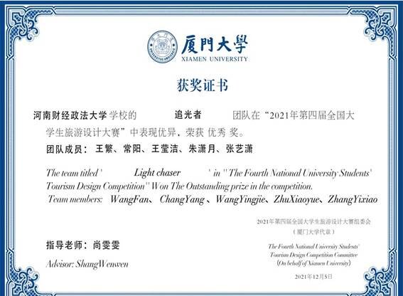 2021年12月,2021年第四届全国大学生旅游设计大赛圆满结束,德赢官网由尚雯雯老师指导的“追光者”团队荣获优秀奖。