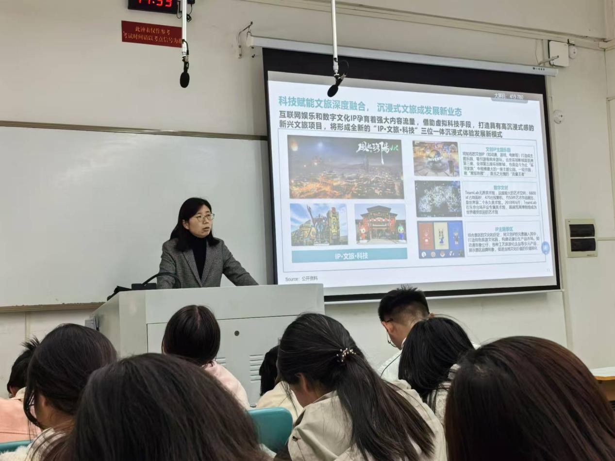 焦珊珊老师以感性视角为起点,引领学生深入探究文旅产业的发展轨迹及其现状。焦老师特别指出,文旅产业不仅限于旅游业的范畴,而是涵盖了文化、艺术、娱乐等多个领域。她通过展示故宫文创、西湖夜游等国内知名文旅项目,生动诠释了文旅产业如何通过创新与融合,有效吸引游客并提升其体验质量。