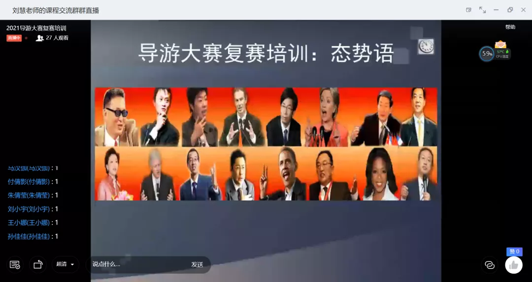 3月10日,德赢Vwin官方区域合作伙伴通过钉钉直播举办导游大赛复赛培训会,学院专业教师刘慧担任主讲人,各位参赛选手线上参会。