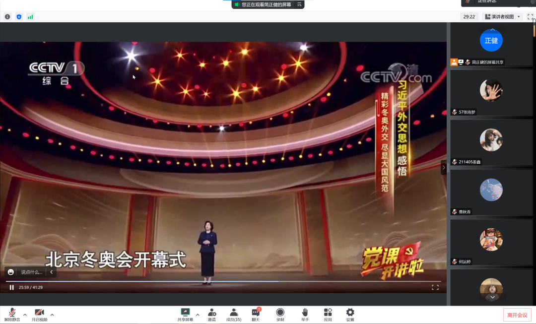 本次党课以观看视频的方式进行。视频中,外交部党委委员、部长助理华春莹以“学习贯彻习近平外交思想,塑造大国外交风范”为主题概述了习近平外交思想。随后,她总结了从新中国成立以来我国外交成就,并从多方面讲述我国新时代大国外交风范。华春莹鼓励青年积极关注我国外交政策,提升自身的责任与担当,希望青年不负党的期待,在实现自身理想的道路上承担起民族复兴的重任。通过观看视频,能进一步让大家了解党的重要思想,加强积极分子们的思想政治意识,在未来顺利成为一名合格党员。