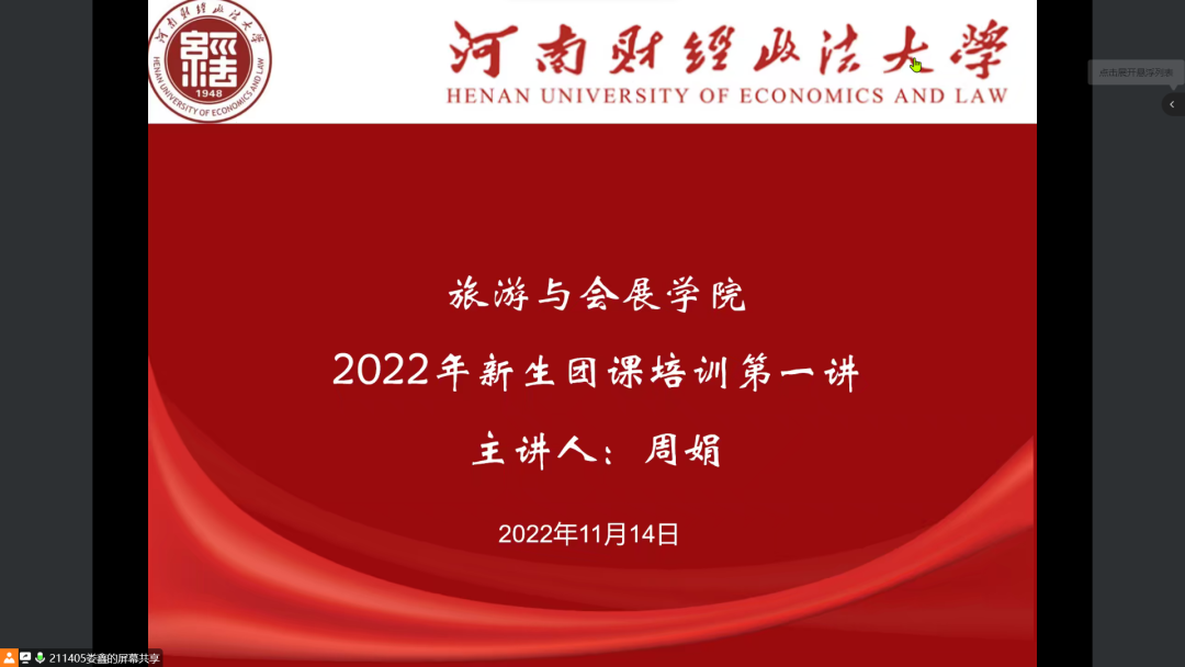 11月14日,德赢Vwin官方区域合作伙伴于腾讯会议开展2022级新生团课培训第一讲。2022级全体学生参加此次培训,学生周娟担任主讲人。