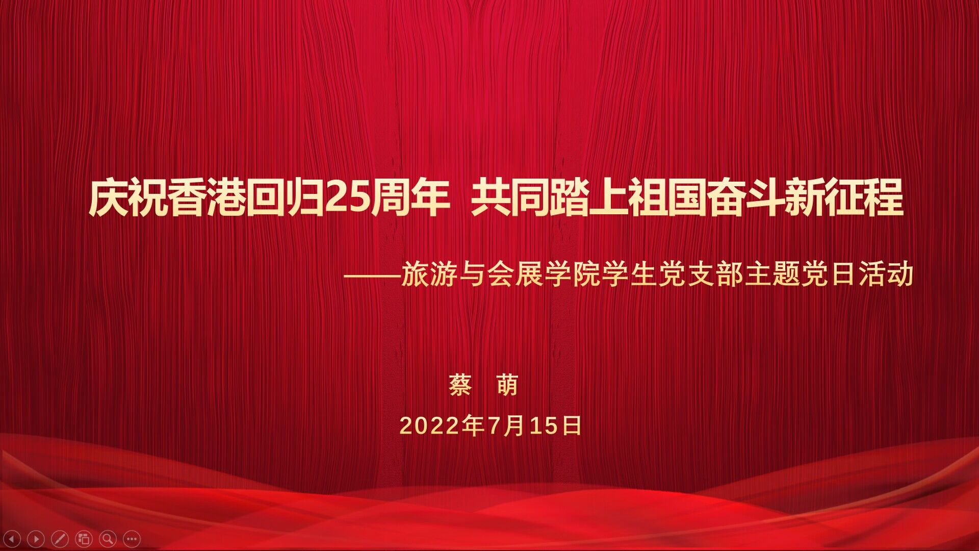 为庆祝香港回归25周年,共同踏上祖国奋斗新征程,7月15日,德赢Vwin官方区域合作伙伴学生党支部于腾讯会议开展主题党日活动。学生党支部全体成员参会,学生党支部书记蔡萌担任主讲人。
