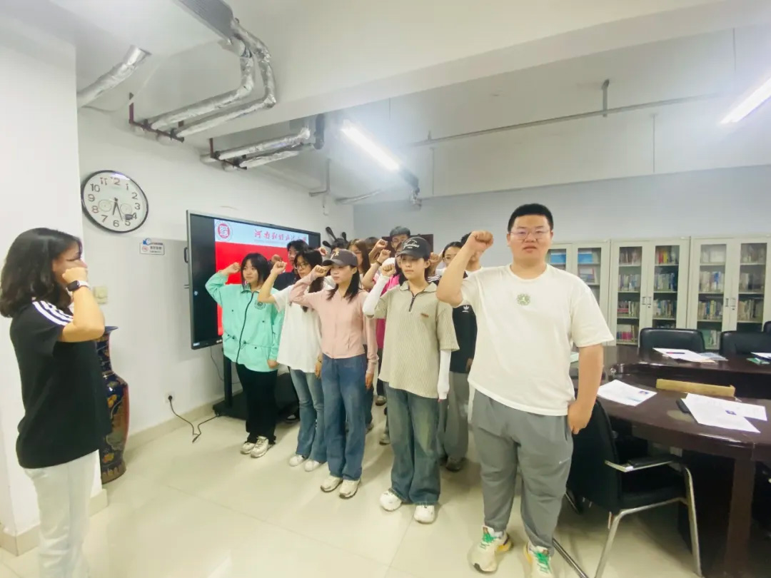 首先,活动负责人李云耐心指导新发展团员填写入团档案,随着档案填写的完成,团员职业生涯中第一份正式档案材料在此建立。接着,由2022级四班团支书高佳莹带领新团员进行入团誓词宣誓,伴随着誓词的宣读,新团员更加清晰地认识到自己身份的转变,满怀对团的信仰和对国家的情怀,同时更加坚定了为共产主义事业而奋斗的理想信念。最后,曹路铭、李云等学生干部给新团员佩戴团徽,新团员入团仪式圆满结束。