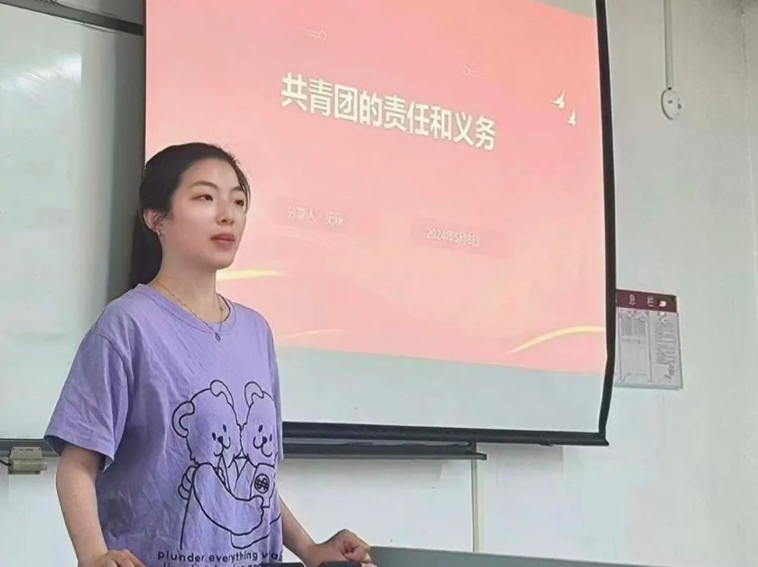 课上,史琛首先向大家介绍了共青团员的义务与责任。她指出,中国共产主义青年团是中国共产党的坚实助手和后备军,共青团员应时时刻刻遵循团的章程,执行团的决议。史琛表示,共青团在不断发展的过程中,既面临着外部的挑战,也面临着内部的问题,因此共青团员们应齐心协力,增强团员意识,共同应对外部的变化,积极主动地为共青团的发展提出改进建议。最后,史琛强调,成为一名团员最主要的目的是为了帮助同学,服务社会,以全新全意为人民服务的奉献精神做好新时代共青团员。