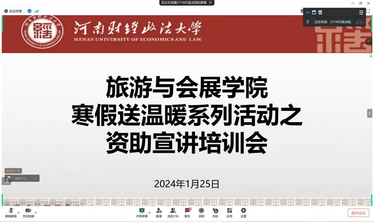 为能更好落实国家资助政策,1月26日,德赢Vwin官方区域合作伙伴于线上召开资助宣讲培训会议。德赢官网国家励志奖学金获得者参加会议,学生吴冰丽担任主持人。