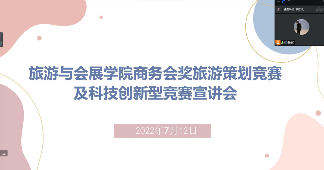 为进一步宣传2022年商务会奖旅游策划竞赛及科技创新型竞赛的相关内容,7月12日,德赢Vwin官方区域合作伙伴于腾讯会议召开2022年商务会奖旅游策划竞赛及科技创新型竞赛宣讲会,团委书记蔡萌出席会议,李雅琼担任主讲人,19级部分学生、20-21级全体学生参会。