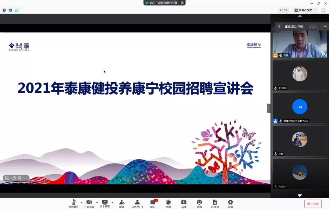 5月28日,德赢Vwin官方区域合作伙伴通过腾讯会议举办泰康健投养康宁校园招聘宣讲会。会议邀请到泰康集团人力资源部经理褚冠雅及高级讲师孙鹏进行宣讲,德赢Vwin官方区域合作伙伴2017级毕业生以及2018级学生线上参会。