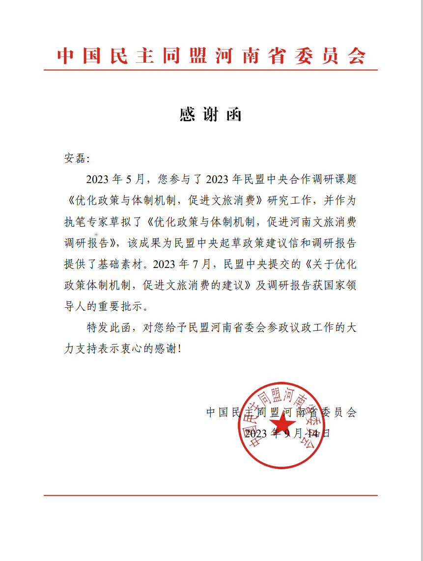 今年5月,安磊作为执笔专家起草了《优化政策与体制机制,促进河南文旅消费调研报告》。该成果为民盟中央提交的《关于优化政策体制机制,促进文旅消费的建议》及调研报告提供了基础素材,建议及调研报告获国家领导人重要批示。
