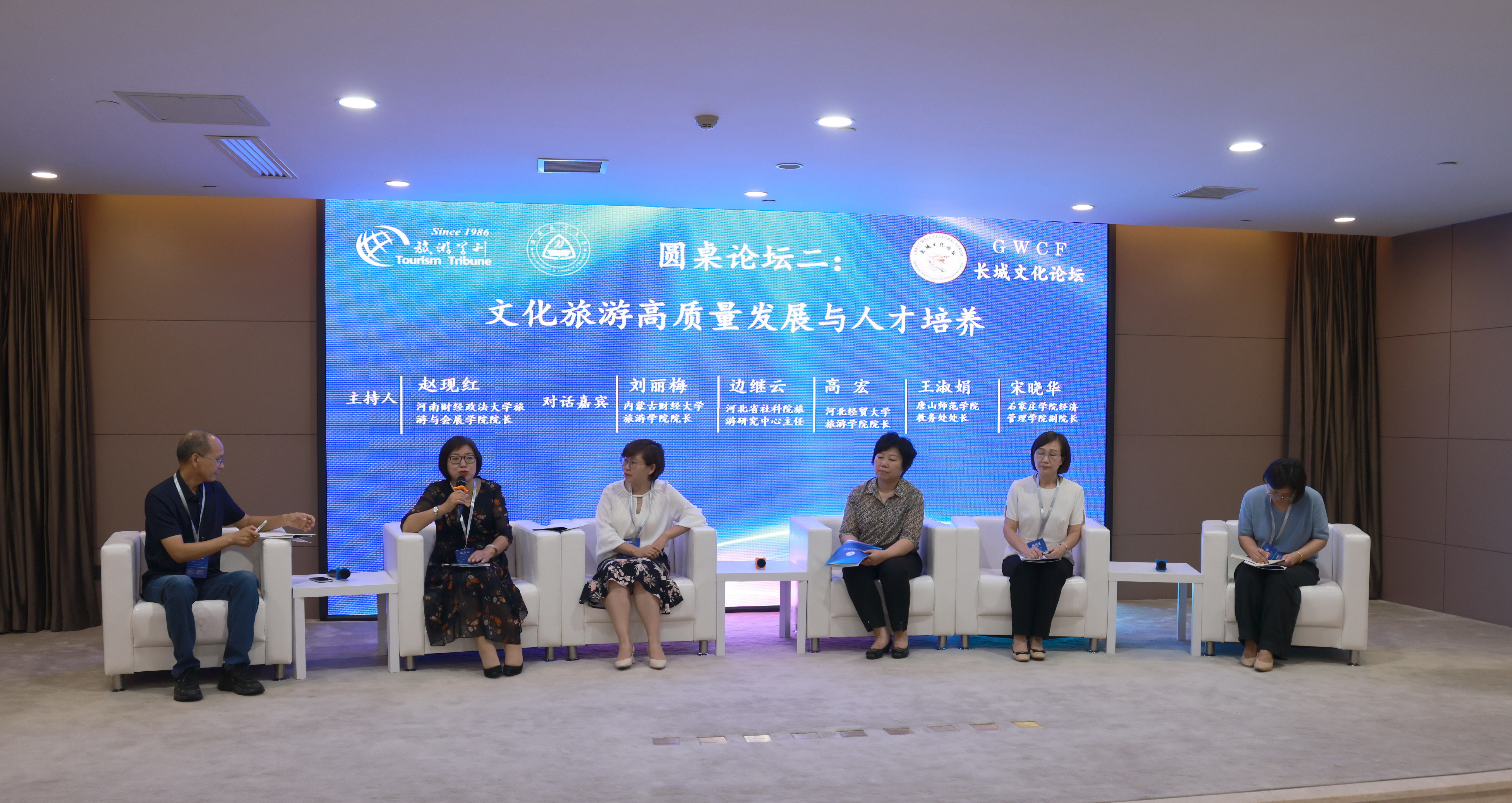 研讨会专设“长城遗产保护与文旅融合”和“文化旅游高质量发展与人才培养”两个圆桌论坛对话,赵现红院长主持了第二圆桌论坛的对话讨论。对话现场,赵现红与内蒙古财经大学旅游学院院长刘丽梅、河北省社科院旅游研究中心主任边继云、河北经贸大学旅游学院院长高宏、唐山师范学院教务处处长王淑娟、石家庄学院经济管理学院副院长宋晓华等五位专家学者一起,结合各自教学和科研工作实践,就“什么是文化旅游高质量发展”、“文旅人才培养面临的问题及解决办法”等话题进行了热烈而深入的交流探讨。