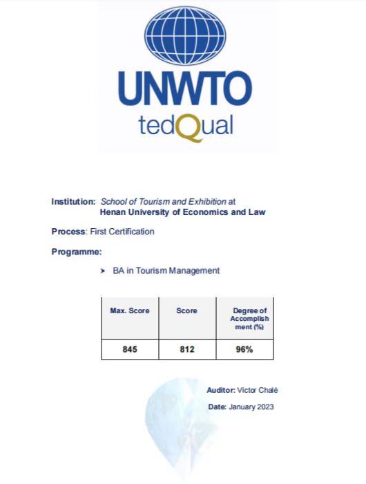 2023年5月9日,联合国世界旅游组织教育质量认证委员会(UNWTO.TedQual)函告通知,德赢官网旅游管理本科专业认证得分812分(满分845分,得分率96%),获得最高等级的年限(四年)认证。德赢官网是初次参与联合国世界旅游组织教育质量认证,高达96%的得分率显示德赢官网建立起高水平、国际化的旅游专业教育体系。