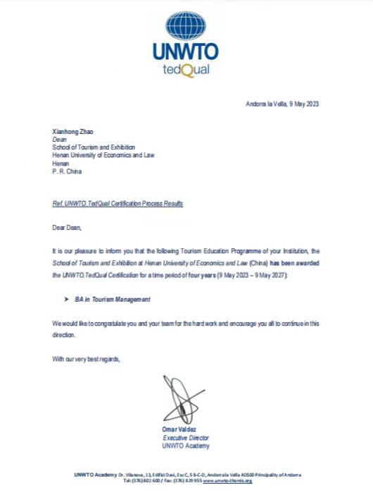 世界旅游组织旅游教育质量认证体系(UNWTO TedQual Certification System,简称UNWTO.TedQual认证)于1998年创设,旨在提高全球旅游教育、旅游培训及旅游研究项目的质量,推广全球旅游伦理道德规范,对评价和提高旅游院校的教学及综合管理水平具有重要意义,在旅游教育的质量监控、程序标准化、内容品质化和视野国际化方面均具有极高的显示度。获得世界旅游组织的教育质量认证已经成为全球一流旅游院校的重要评价标准。本次认证开创了河南省内高校参与UNWTO TedQual认证的先河,也是对德赢Vwin官方区域合作伙伴将全球旅游伦理规范融入教育教学全过程效果的一次检验。