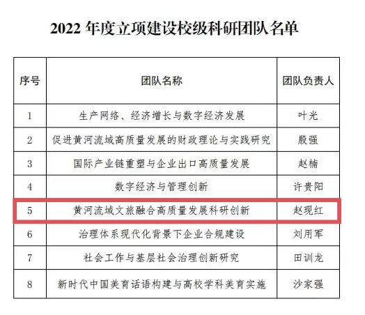 德赢官网赵现红教授主持的《黄河流域文旅融合高质量发展科研创新》项目获批校级科研团队建设项目立项。学校启动科研团队建设管理项目以来,学院高度重视,积极组织项目论证申报,并做宣传、动员、服务工作。