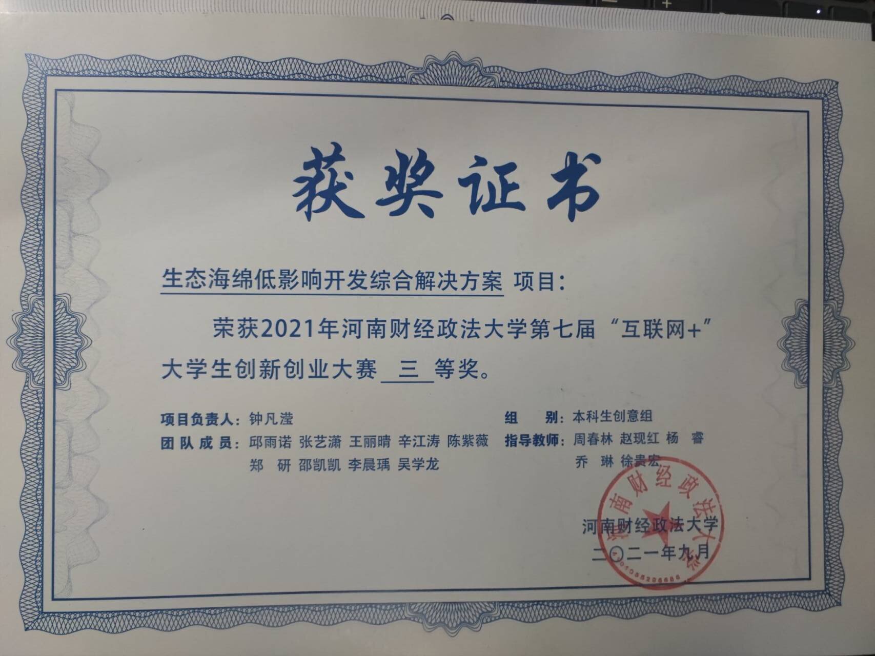 2021年10月,河南省“互联网+”大学生创新创业大赛暨第七届中国国际“互联网+”大学生创新创业大赛河南赛区选拔赛顺利举行,德赢官网赵现红教授、周春林老师等教师指导的项目《生态海绵低影响开发综合解决方案》荣获河南省三等奖。